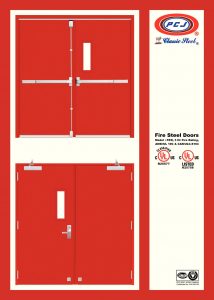 PCJ manufacture and distribute Fire Steel Doors, 3 Hr Fire Rating, ANSI/UL 10C & CAN/ULC-S104. Various type, styles, finish : Single Doors, Double Doors, Flush Doors, Flush with Vision Panels, Embossed Doors, Powder Finish, Wood Grain Finish as well as various types of hardware are available upon request. 2 Hr Fire Steel Doors and Non-Fire Steel Doors are also available upon request to fulfill most requirements.